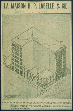 Construit en 1910, le bâtiment s’appelle alors Édifice Labelle et abrite la salle d’exposition et les bureaux du magasin de meubles d’H.P. Labelle. Auparavant installée sur la rue Notre-Dame, la compagnie déménage alors sur la rue Sainte-Catherine, qui, depuis l’arrivée du grand magasin Morgan en 1891, ne cesse d’évoluer comme l’artère commerciale la plus foisonnante de la ville. Outre les grands magasins qui essaiment la rue d’est en ouest, les théâtres et cabarets apparaissent… Bref, la rue Sainte-Catherine bouillonne d’activités et se présente comme un lieu de divertissement prisé.