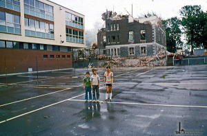 Trois enfants dans la cour de l'école Ludger-Duvernay avec, en arrière plan, la démolition de l'école Saint-Raymond Classique. Anonyme. 1971. Société d'Histoire de Saint-Henri: 179ph1197.